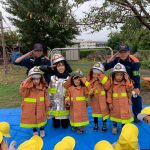 ちびっこ消防士さんも登場…防火服にヘルメットを身に着け、敬礼のポーズのやり方を教えてもらい、気分は消防士でした![]()
