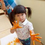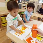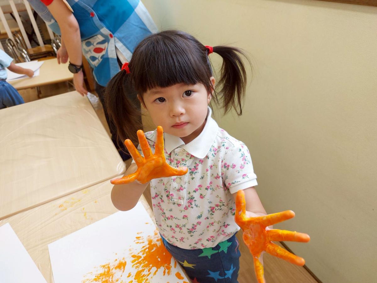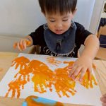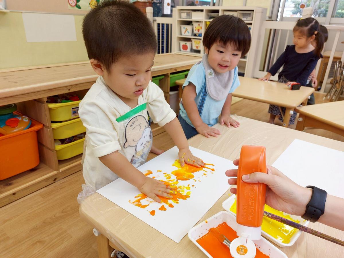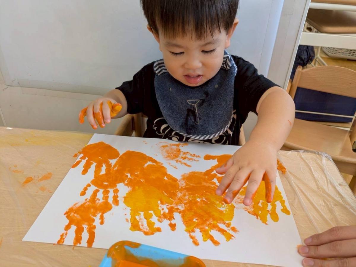 絵の具遊びをしました。秋の色彩を使って、手のひらや指先で絵の具の感触を楽しみながらの制作。