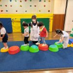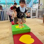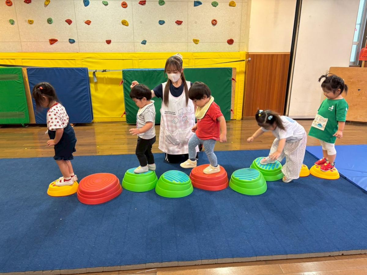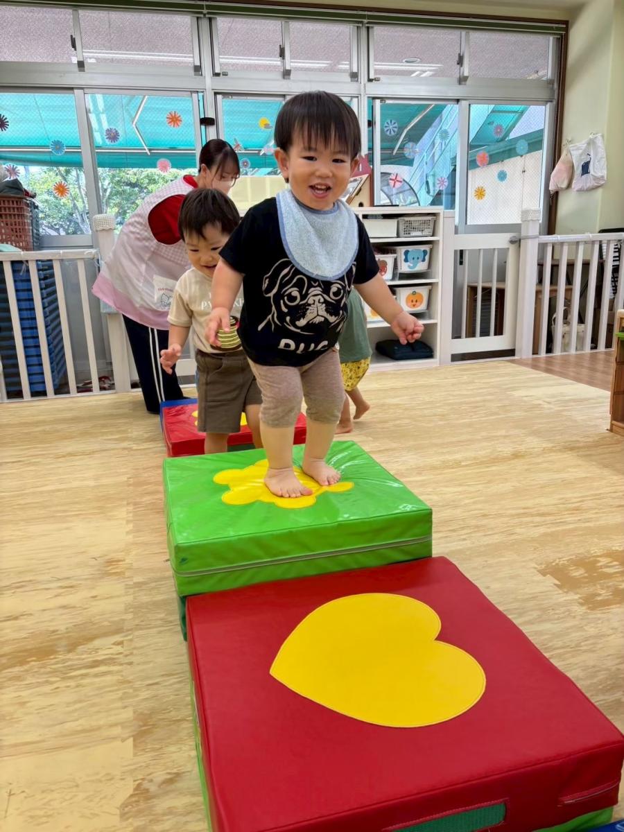 体を動かすことが大好きな子どもたち。保育室やホールでサーキット遊びをしています。