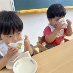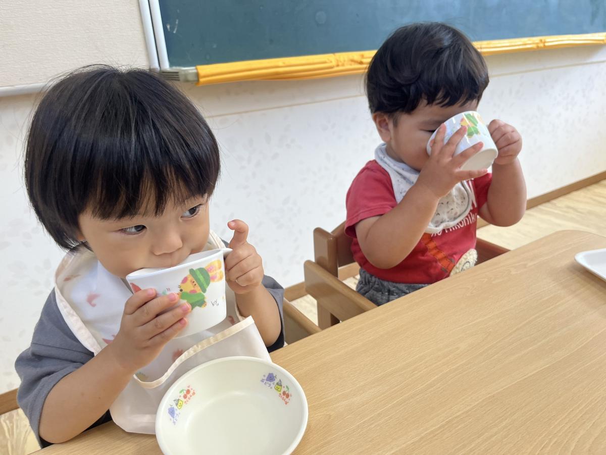0歳児のお友だちも、手掴みやフォークを使って、自分で食べようと頑張っています。