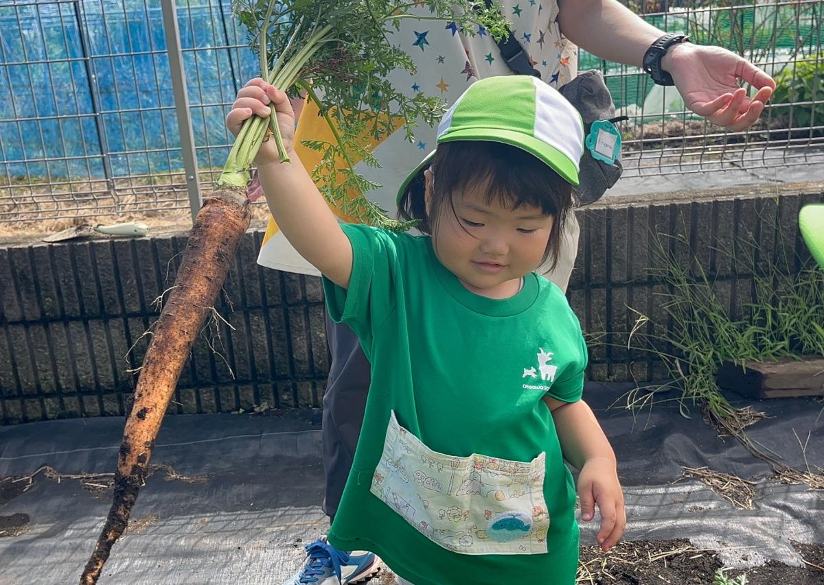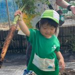 食材が気になり、「これなぁに?」と聞く姿も。先生が「ニンジンさんだよ」「お魚さんだよ」と伝えると、真似をして一生懸命に言おうとする姿が微笑ましい子どもたちです。