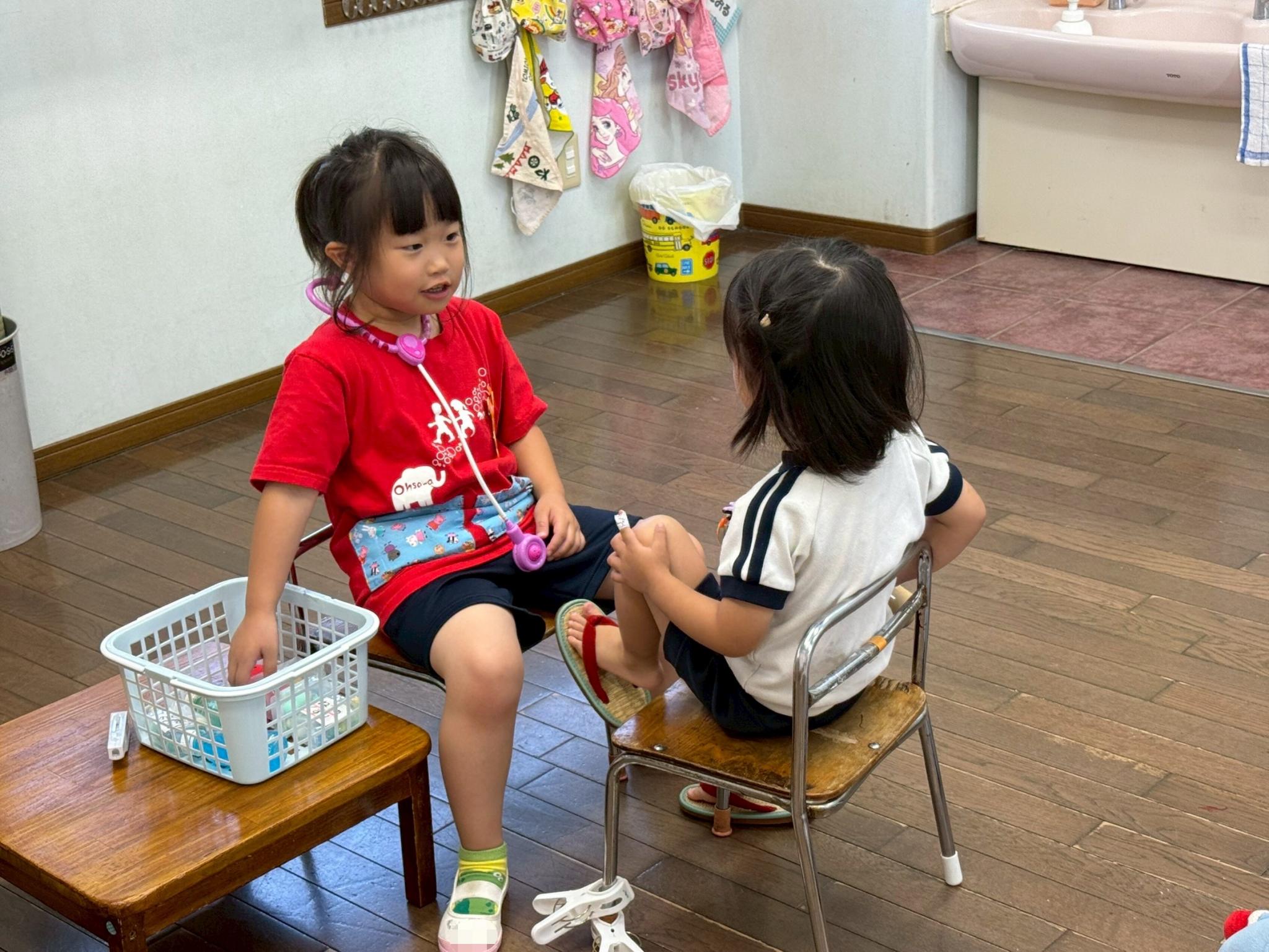 お医者さんごっこは、「次の方どうぞ~」「お腹が痛いんです」とお医者さんと患者さんになりきっています