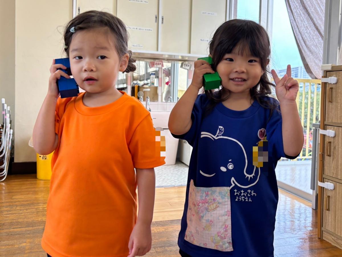 最近はレゴブロックを楽しんでいます。ブロックを高く積み上げていた子たちは「こっち持ってて!」「椅子を使ったらもっと高く積めるかも!」と、高く積み上げる方法を考えながら、真剣に取り組んでいました。電話を作っている子は、友だちや先生と「もしもし?あのね…」と、お話をすることを楽しんでいます「あれ?かからないな…」なんて、電波障害もたまに起こるようで、子どもたちの発想が面白いです。