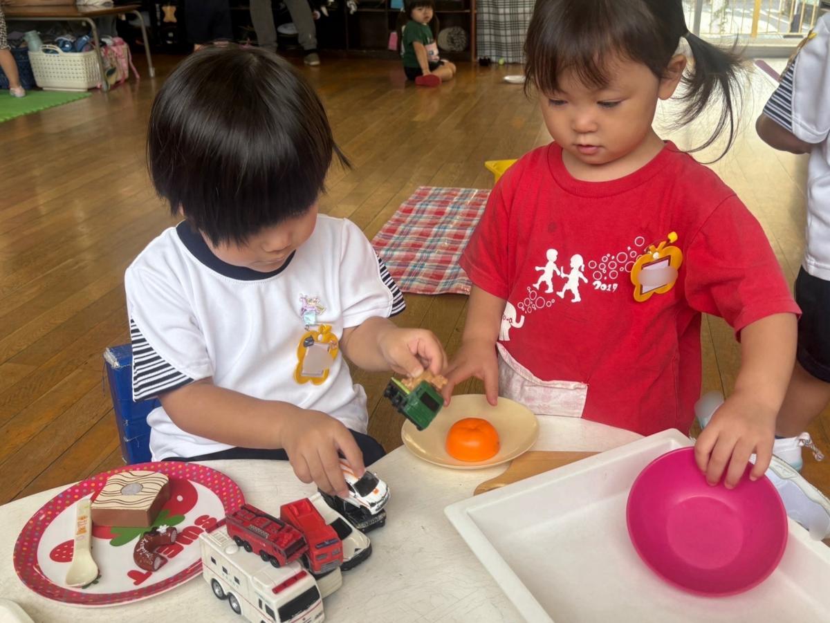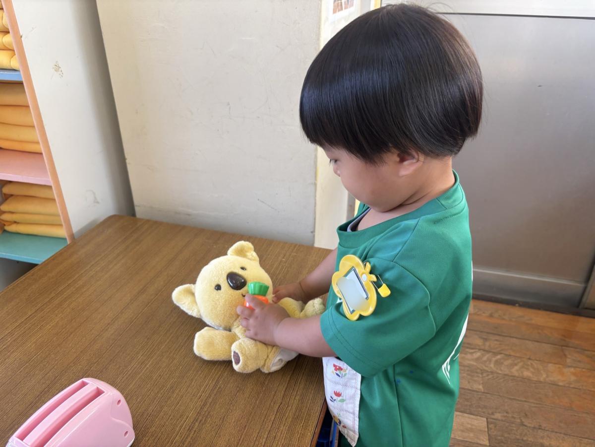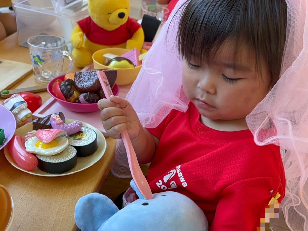 おうちごっこでは、料理を作って、お友だちや先生にふるまったり、人形にご飯を食べさせたり、寝かしつけをしたり…。小さなお母さん、お父さんに、ほっこりした気持ちになります