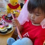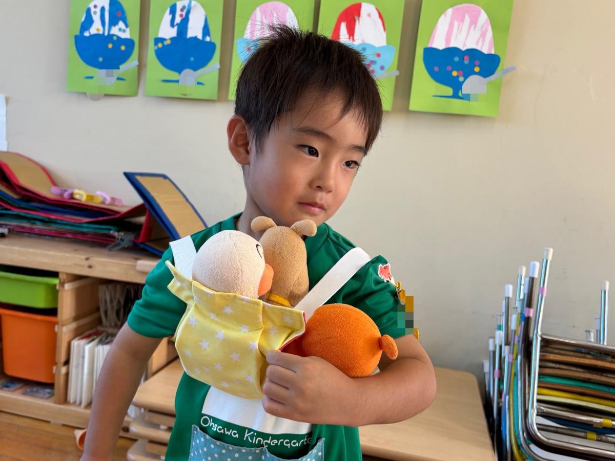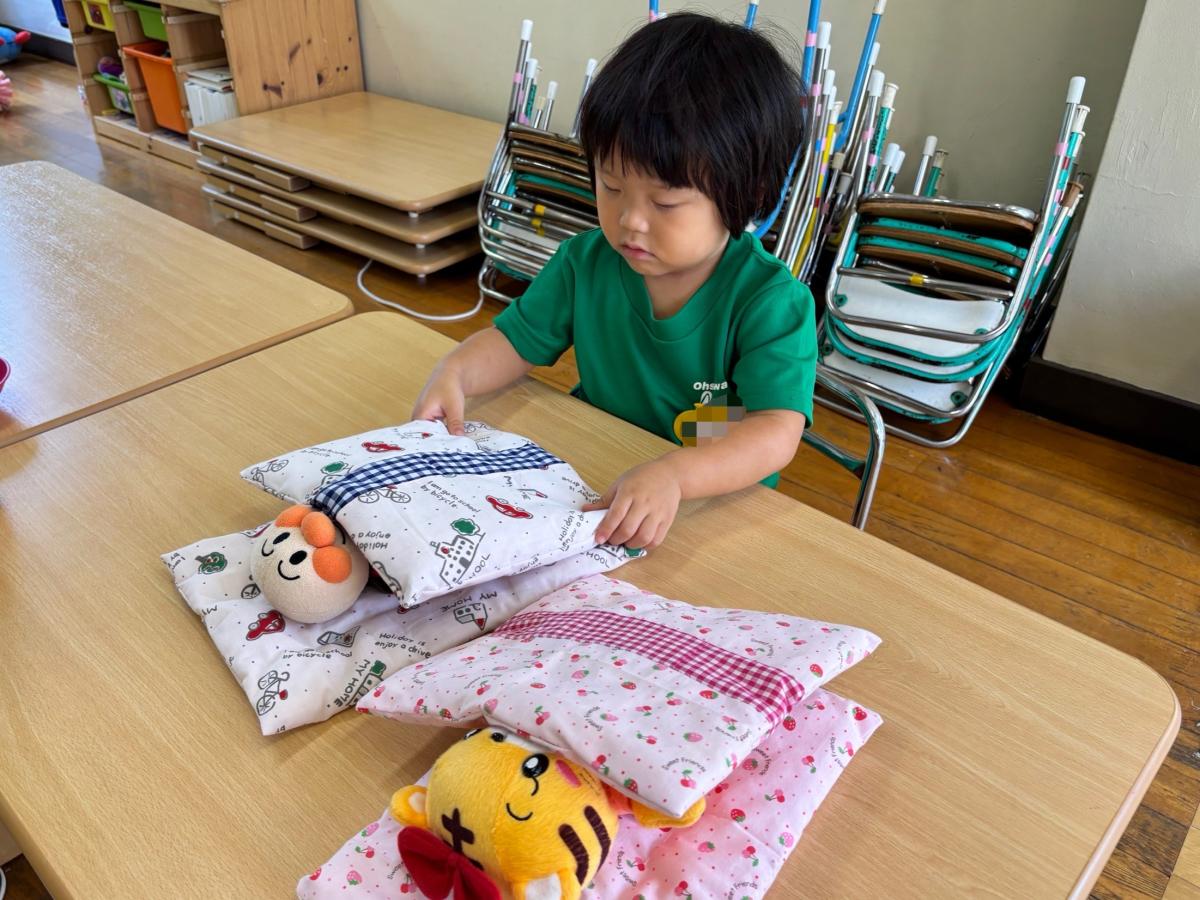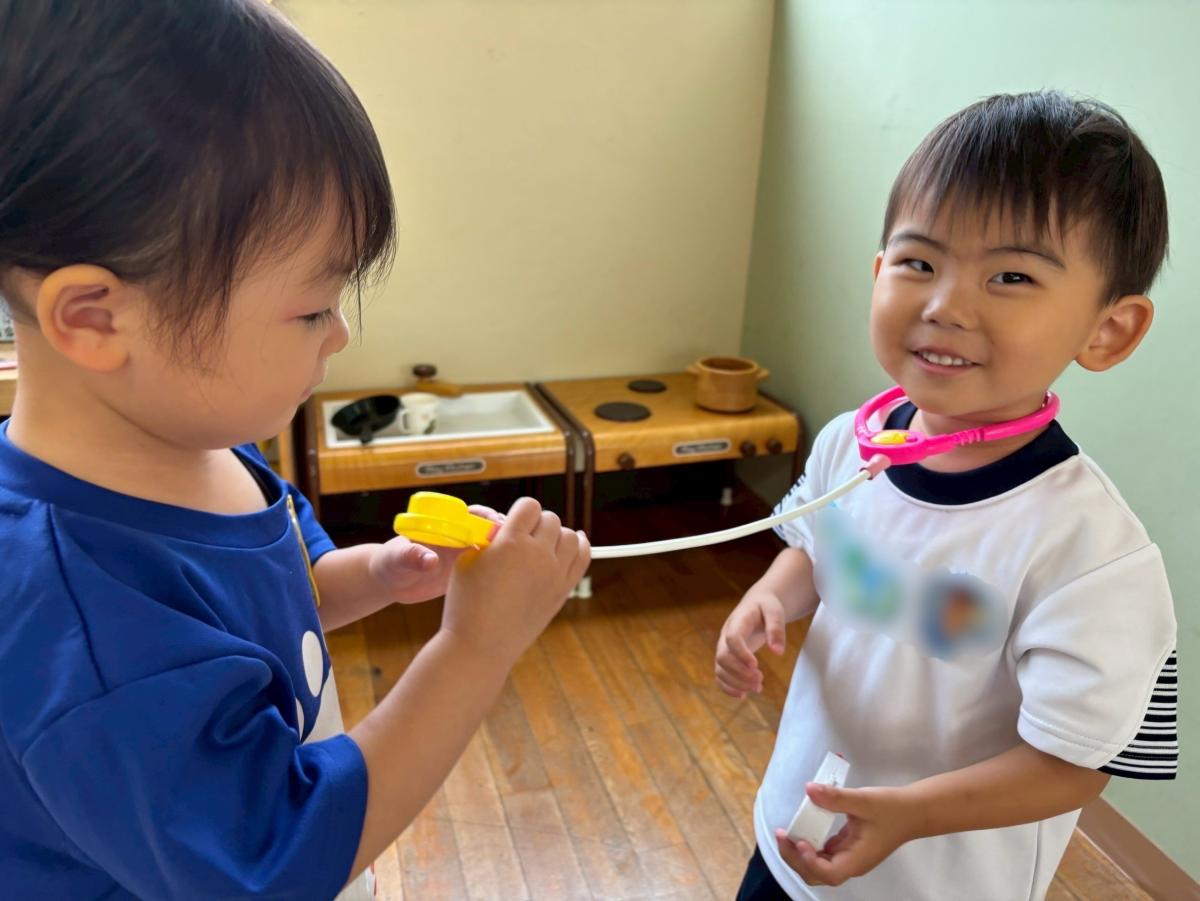 おうちごっこでは、料理を作って、お友だちや先生にふるまったり、人形にご飯を食べさせたり、寝かしつけをしたり…。小さなお母さん、お父さんに、ほっこりした気持ちになります