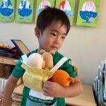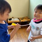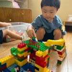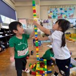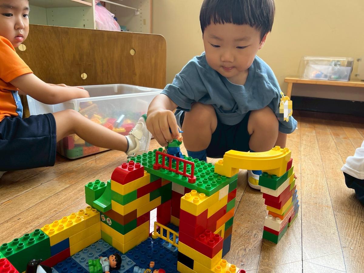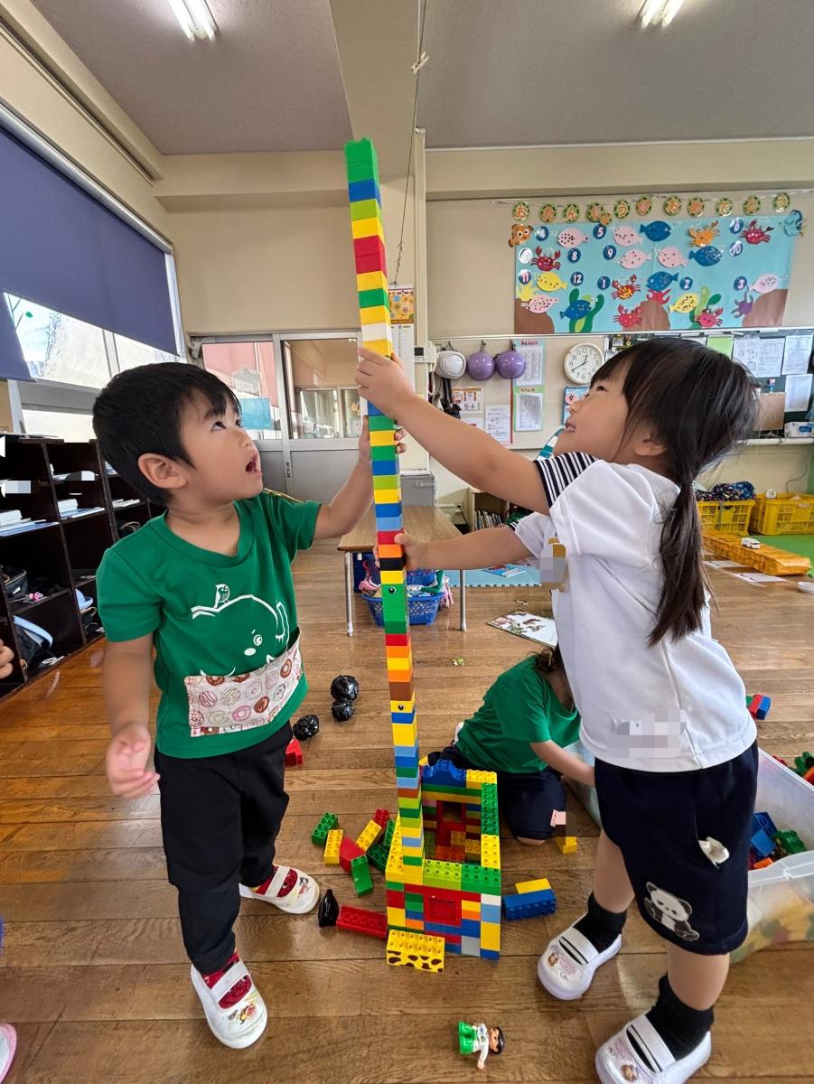 最近はレゴブロックを楽しんでいます。ブロックを高く積み上げていた子たちは「こっち持ってて!」「椅子を使ったらもっと高く積めるかも!」と、高く積み上げる方法を考えながら、真剣に取り組んでいました。電話を作っている子は、友だちや先生と「もしもし?あのね…」と、お話をすることを楽しんでいます「あれ?かからないな…」なんて、電波障害もたまに起こるようで、子どもたちの発想が面白いです。
