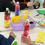 『何色の鬼にしようかな』『花紙を1枚にするとかんたんに入る』『1本の指で押すとすぐ入る!』と、花紙をペットボトルの中に入れる作業にとても集中していましたよ。