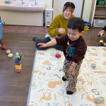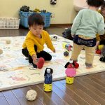 一度『鬼は外♪』と言いながらペットボトルの鬼に玉を当てて倒すのを見せると笑顔で玉を拾いに来たお友だち。