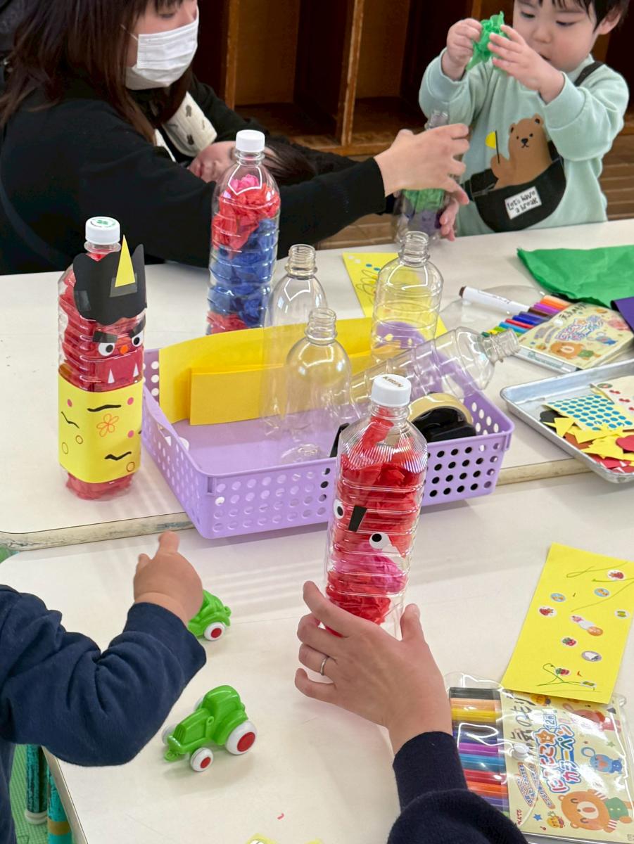 『何色の鬼にしようかな』『花紙を1枚にするとかんたんに入る』『1本の指で押すとすぐ入る!』と、花紙をペットボトルの中に入れる作業にとても集中していましたよ。