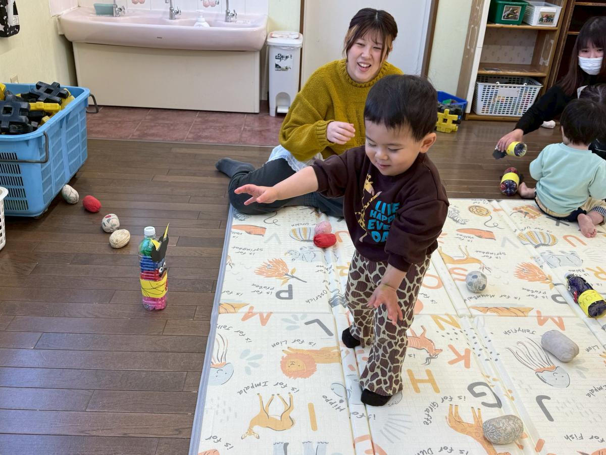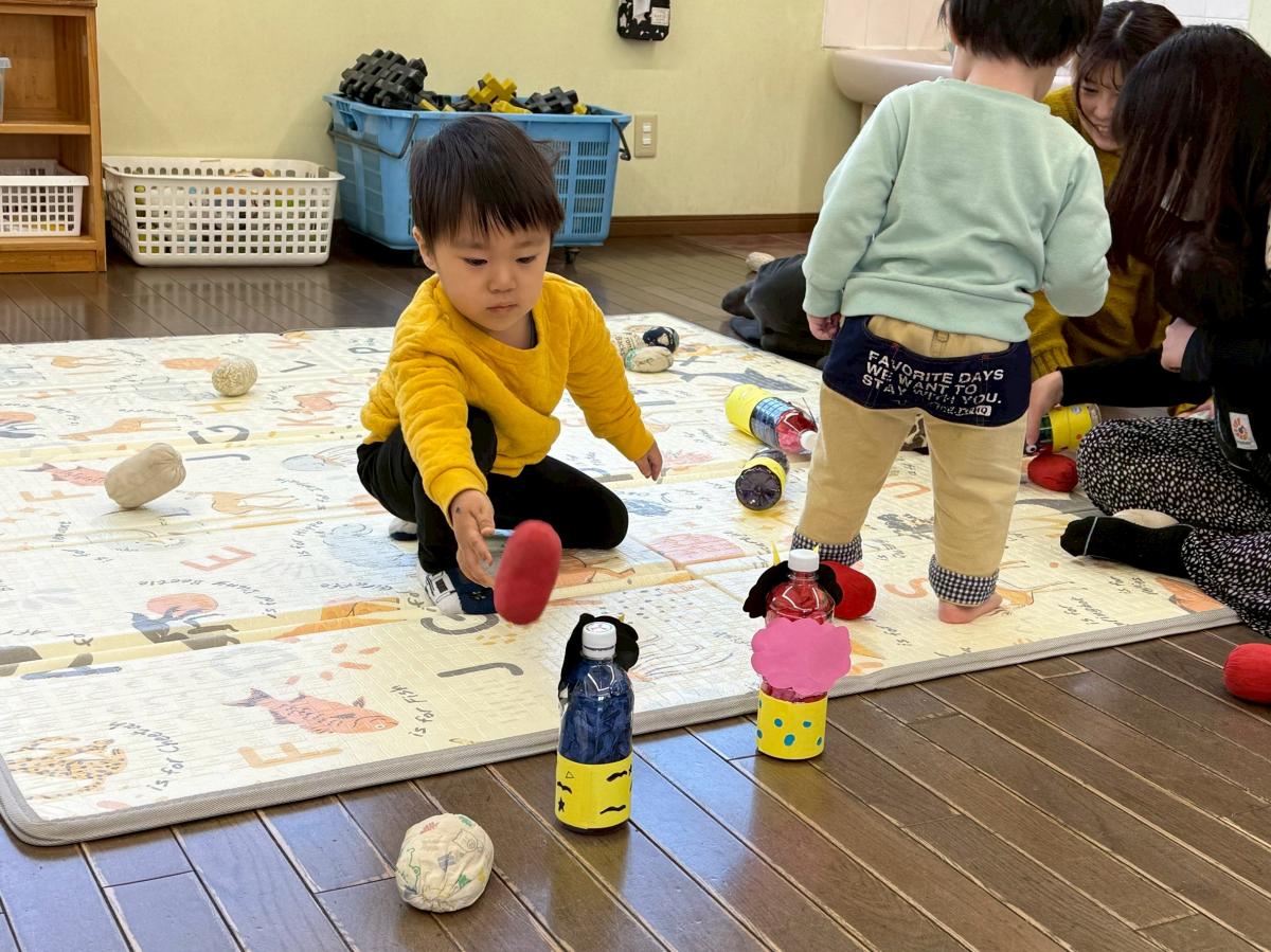 一度『鬼は外♪』と言いながらペットボトルの鬼に玉を当てて倒すのを見せると笑顔で玉を拾いに来たお友だち。