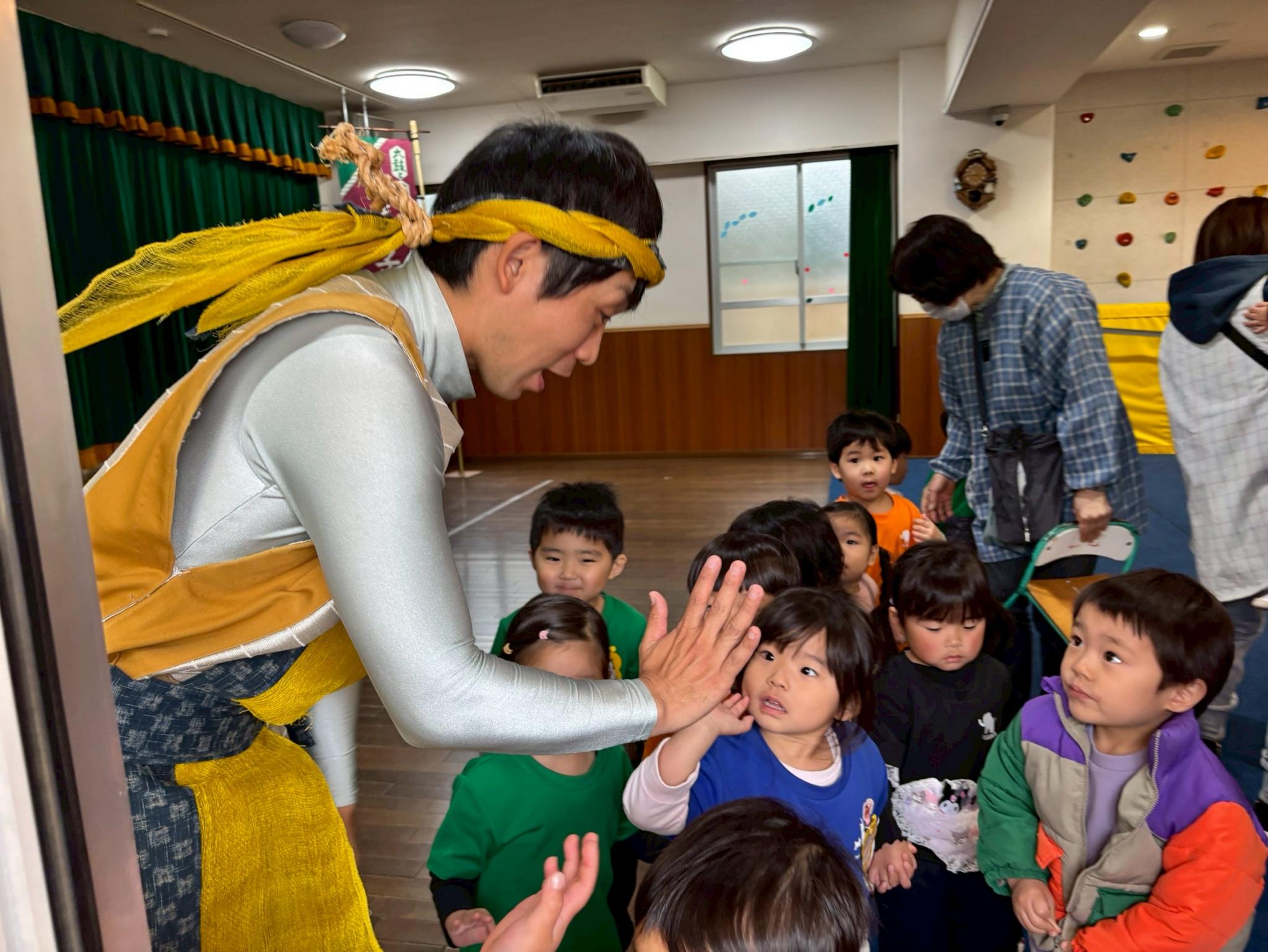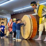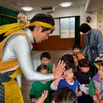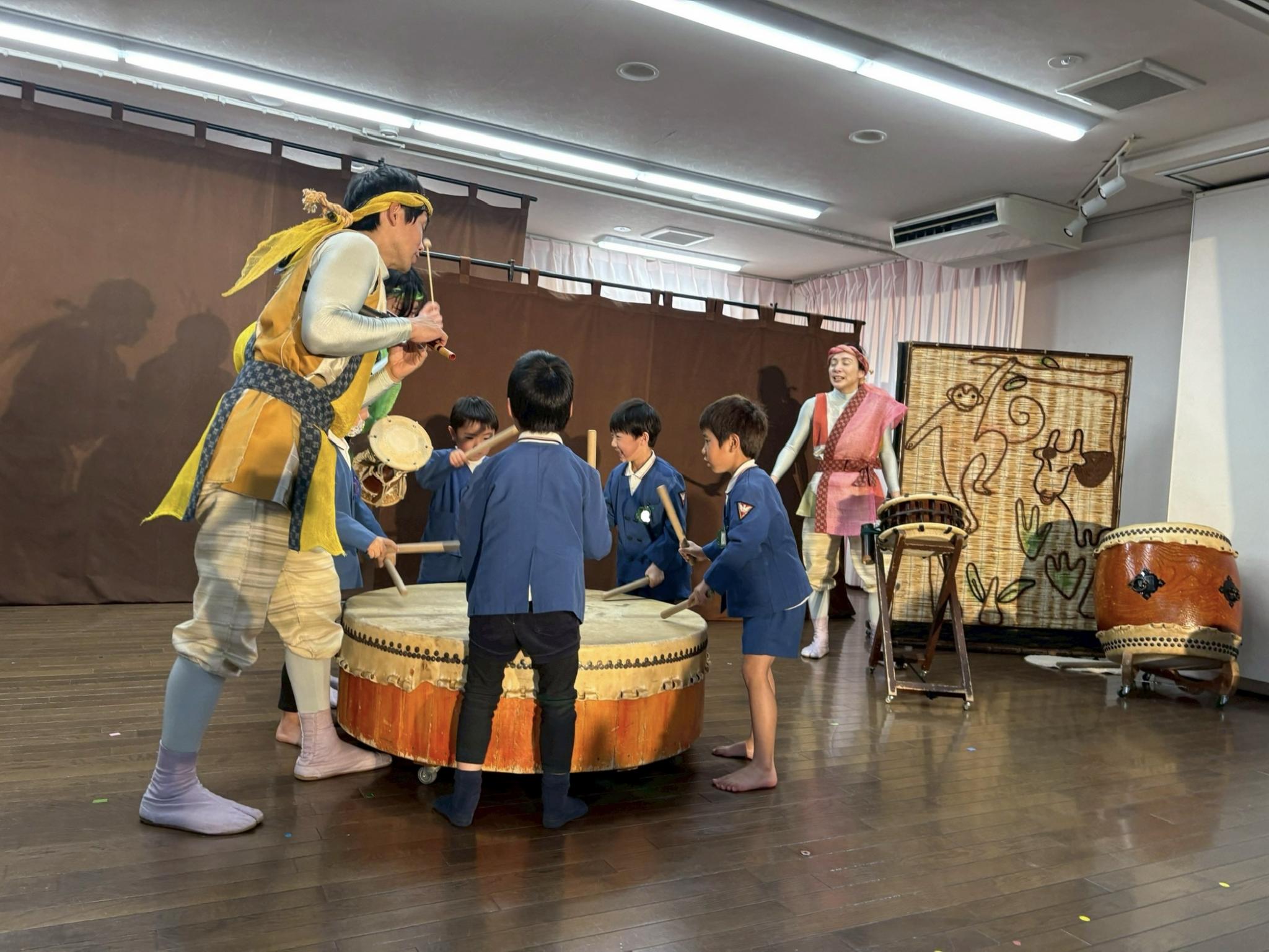 様々な大きさや音の太鼓や、横笛などの楽器を使い、子どもたちを楽しませてくれました。