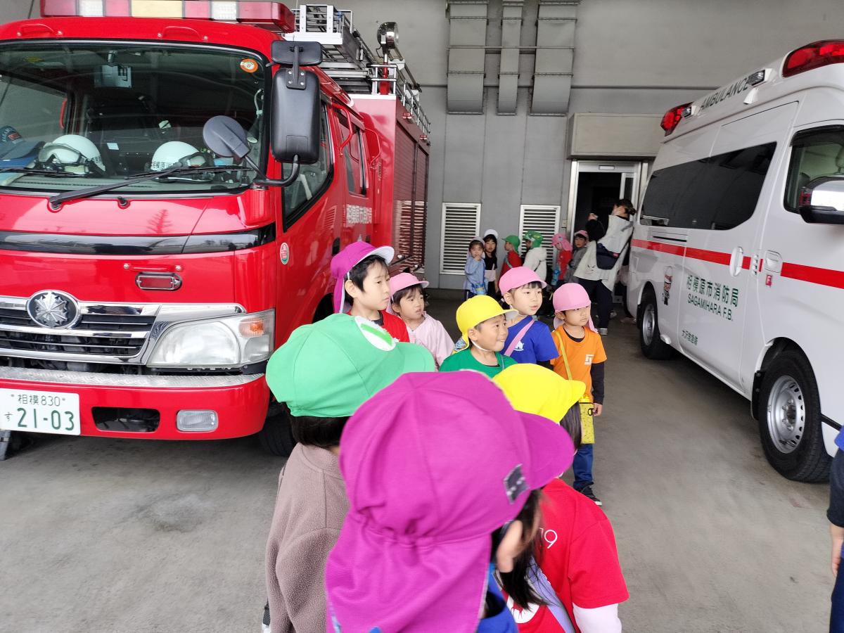 消防署や小学校まで足を延ばして、いつもとは違うお散歩コースに子どもたちはわくわく