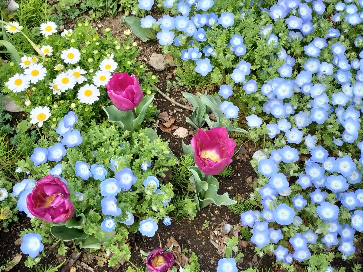 ネモフィラやチューリップなどなど…色とりどりのお花が元気に咲いています