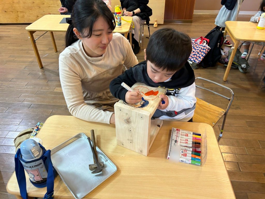 今日は幼稚園で木工クラフトを行いました 本立てコースと椅子コ…