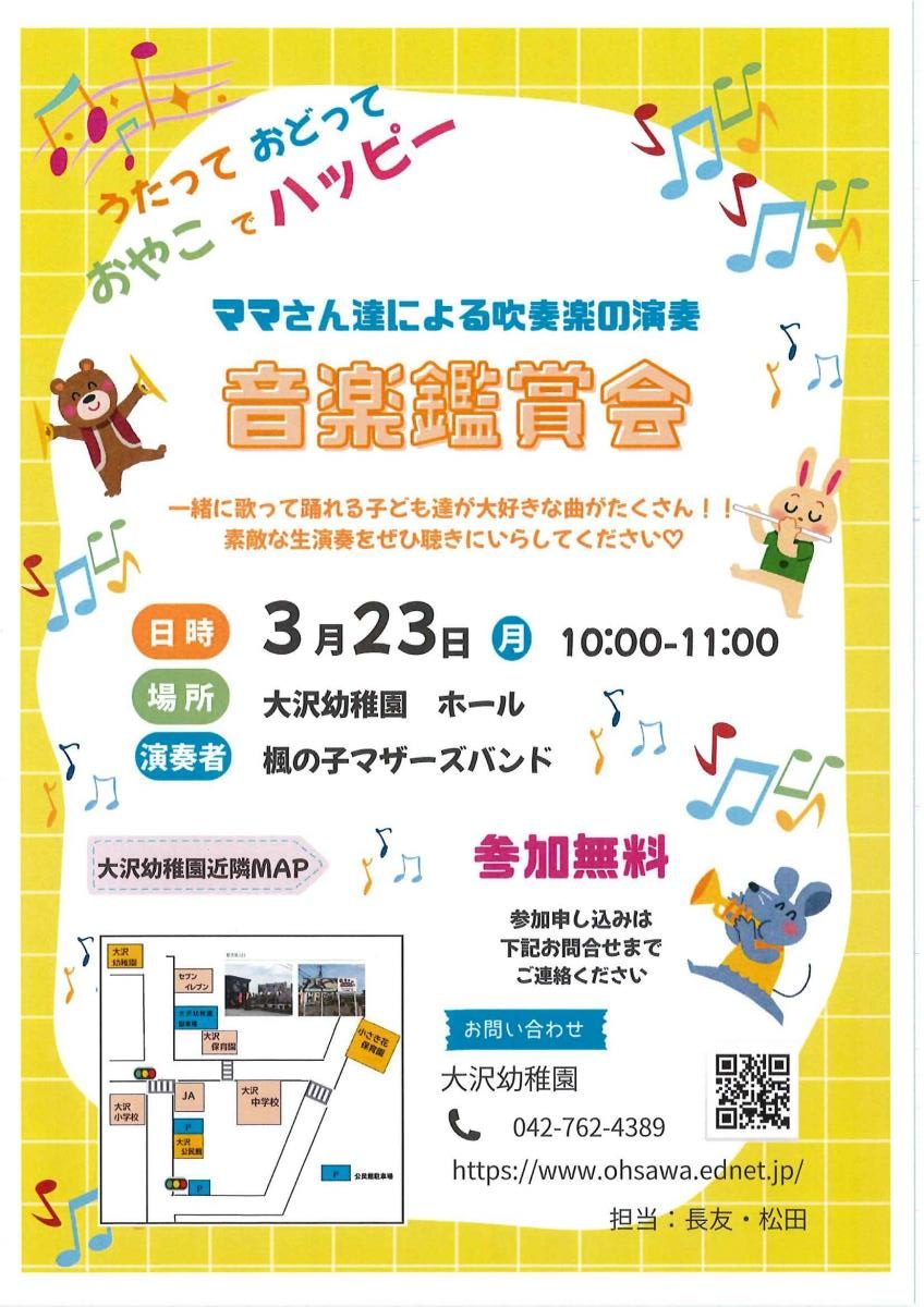 大沢幼稚園のホールで、楓の子マザーズバンドさんの演奏会を開きます。